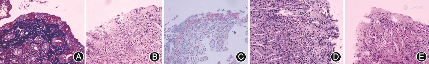 入院查体:神志清,睑结膜、口唇面色苍白,腹部查体无异常。辅助检查:免疫球蛋白及补体测定示IgG4升高(2.46 g/L),余正常。超敏C反应蛋白、红细胞沉降率、抗核抗体、葡萄糖6-磷酸脱氢酶活性均正常。胃镜示胃底、胃体黏膜弥漫性粗糙,颗粒样隆起。胃窦黏膜充血水肿。十二指肠球部黏膜粗糙、糜烂,降部黏膜光滑。RUT阴性。组织病理学示胃窦及胃底黏膜中度慢性炎,上皮部分脱落,上皮下见斑片状胶原沉积,最厚处126 μm及124 μm。胃窦嗜酸粒细胞计数约45个/高倍镜视野。胃体黏膜未取活检组织。十二指肠球部黏膜绒毛萎缩,上皮下见斑片状胶原沉积(图1E),最厚处72 μm。降部黏膜无殊。Masson 三色及天狼猩红染色见不规则胶原沉积;美兰、刚果红染色阴性。诊断为CG并累及十二指肠。
