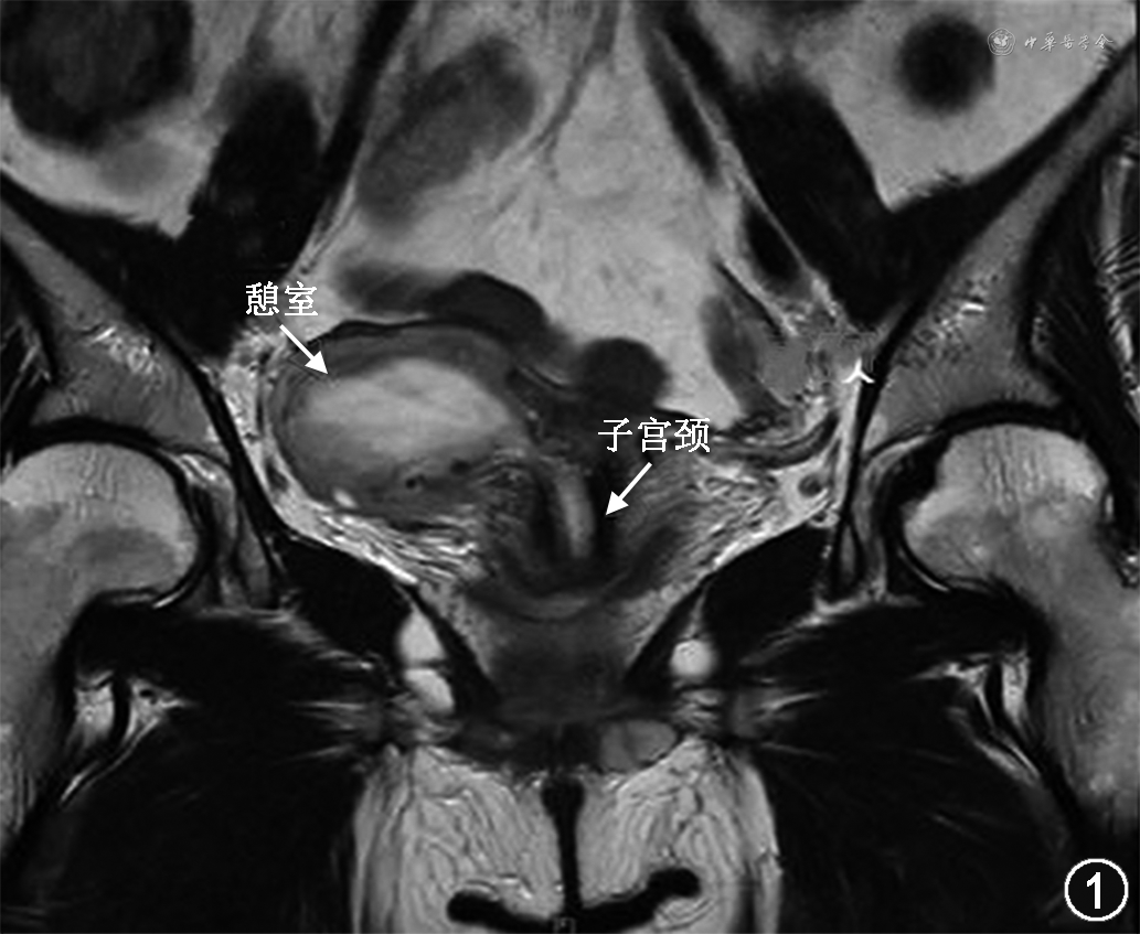 9月10日入院后,复查经阴道超声提示:子宫峡部右前壁探及向外突起的、边界清晰的低回声5.5 cm×5.6 cm×3.4 cm,其内可见形态不规则的不均质低回声,其内血流信号不丰富,考虑浆膜下子宫肌瘤变性可能。泌尿系统超声检查提示双侧肾、输尿管未见异常。盆腔MRI检查提示:子宫右前方浆膜下团块状混杂等T1长T2为主信号影,局部与宫腔相通,大小为4.7 cm×5.0 cm×4.6 cm。见图1。检测血清抗苗勒管激素水平为3.37 μg/L,提示卵巢储备功能正常。患者于9月14日在全身麻醉下接受了宫腔镜联合腹腔镜检查;腹腔镜检查见子宫后位,正常大小,活动好,子宫峡部右侧前壁可见囊性包块凸向阔韧带,直径6 cm,双侧输卵管外观未见明显异常、正常插入双侧宫角,双侧卵巢外观未见异常;转宫腔镜检查,逐步扩张宫口至10号扩宫棒,置镜见子宫颈管内可见两个开口,见图2,沿扩张后的右侧开口进入,见腔内囊壁粗糙,似被覆内膜样组织,伴活动性出血,此时腹腔镜下见宫腔镜操作位于子宫峡部前方包块内,退镜后,于腹腔镜监视下扩张子宫颈管内的另一开口后再次宫腔镜检查,沿子宫颈管内左侧开口进入,见宫腔形态正常,子宫内膜呈粉色,双侧输卵管开口可见,因此考虑右侧空腔为子宫颈憩室。