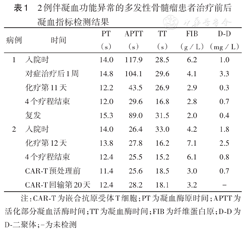 注:CAR-T为嵌合抗原受体T细胞;PT为凝血酶原时间;APTT为活化部分凝血活酶时间;TT为凝血酶时间;FIB为纤维蛋白原;D-D为D-二聚体;-为未检测