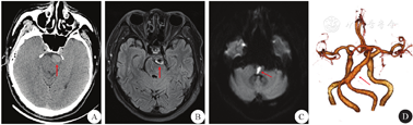 A:CT提示椎基底动脉扩张,脑干受压(箭头所示);B:MRI T2加权FLAIR序列血管高信号征(箭头所示);C:DWI示桥脑延髓斑片状高信号(箭头所示);D:CTA示双侧椎动脉V4段、基底动脉增粗,径约9 mm,走行迂曲(箭头所示);FLAIR:液体衰减反转恢复;CTA:CT血管成像