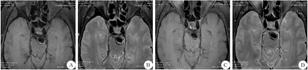 A:抗凝治疗前HRMRI T1上基底动脉管腔内稍长T1信号;B:抗凝治疗前HRMRI T2上基底动脉管腔内长T2信号;C:抗凝治疗后HRMRI T1上基底动脉内稍长T1信号较前减少;D:抗凝治疗后HRMRI T2上基底动脉管腔内长T2信号较前减少;HRMRI:高分辨率MRI