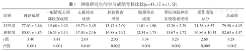 观察组学生的理论成绩、一般情况头颈部检查成绩、心脏检查成绩、肺脏检查成绩、腹部检查成绩、脊柱四肢神经系统检查成绩、操作成绩总分及总成绩均高于对照组,差异有统计学意义(表1)。