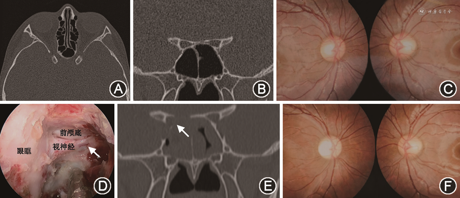 1. 治疗方法:(1)视神经管减压术方法如下:按Messerblinger术式,0°鼻内镜下切除钩突,打开筛泡和中鼻甲基板,切除后组筛窦,开放同侧蝶窦,确认蝶窦内视神经、颈内动脉管等解剖结构,沿纸样板向后暴露并确认眶尖,磨钻磨薄眶尖、视神经管内下壁骨质后,显微剥离子剥除骨片,向内达到视神经管颅口处,必要时磨除视神经管上壁,视神经鞘膜根据情况是否切开,切开应在尽量偏离眼动脉,避免增加对视神经的损伤。对于蝶窦气化不良患者,可使用神经导航进行术中定位(典型病例见图1)。(2)激素治疗:激素冲击治疗使用甲泼尼龙30 mg/kg,首剂最大500 mg,静脉滴注,3 d后改为口服泼尼松,逐渐减量至14 d停药。同时给予神经营养和改善微循环等药物治疗。