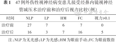 47例患者中,男35例,女12例。男∶女=2.92∶1,年龄3.0~12.0(7.2±2.3)岁。右侧受伤25例,左侧受伤22例。所有患者均接受EOND术,其中30例(63.8%)同时接受激素治疗。经手术以及激素治疗后,28例(59.6%)患者视力较治疗前明显好转,治疗前后视力情况见表1。