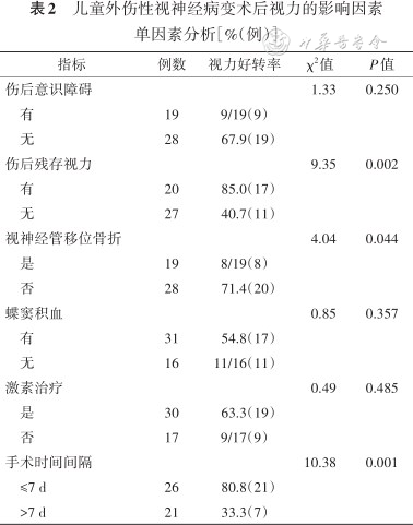 EOND已经成为目前治疗TON的重要外科手段。但是,关于手术时机的选择,仍存在争论。动物研究结果显示,TON后3 d会出现视神经脱髓鞘、炎性反应和视神经水肿等病理性改变[16]。目前研究认为,伤后7 d,特别是伤后3 d内进行手术干预是影响预后的重要因素[17, 18]。本研究由于客观原因,很少患者在3 d内完成手术,主要是在7~10 d内完成。因而,伤后手术时间是术后视力恢复重要的决定因素之一,TON明确诊断后及早行EOND和激素治疗对于儿童TON视力恢复具有重要的作用。