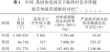 从表1可以看出,我国的临终患者遭受痛苦折磨的人数是英国的17倍,但从2011至2013年在疼痛缓解药品的消费量方面,中国的消费却不到英国的一半。与美国相比,我国临终伴随疼痛的人数是其4.2倍,但美国对疼痛缓解药品的消费量却是中国的50倍。美国患者人均使用68 000 mg,而在中国患者则为314 mg。从严重疼痛相关的情况被满足的百分比的对比来看,我国仅满足不到16%的患者,英国则达到500%以上,美国更加超量[2]。