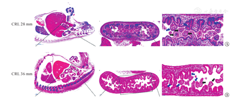 胚胎头臀径(crow-rump length,CRL)28 mm(孕9周)肠腔可见细小腔隙,管腔形状不规则,可见黏膜上皮化,液泡离心性融合,囊壁形成黏膜上皮层。胚胎CRL 36 mm(孕10周)肠腔腔隙进一步扩大,肠腔内液泡不断融合黏膜上皮,直到完成再通。