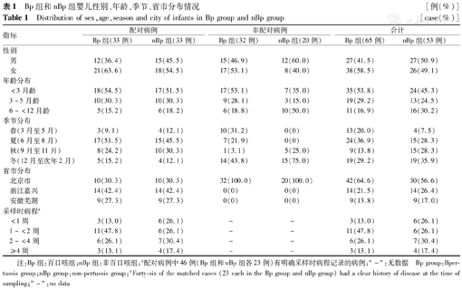 本研究中Bp组和nBp组婴儿性别、年龄、季节、省市分布情况见表1。33对配对病例按月龄、季节、地市进行严格配对,Bp组和nBp组性别差异无统计学意义(P>0.05),其中23对配对病例有明确的采样时病程天数记录,Bp组采样前病程1~<2周患者最多,占比47.8%,nBp组采样前病程2~<4周患者最多,占比30.4%,其时间分布在Bp组和非Bp组差异无统计学意义(P>0.05)。非配对病例均来自于北京,Bp组与nBp组性别差异无统计学意义(P>0.05);月龄和发病季节分布有所不同,Bp组患儿以<3月龄婴儿为主(53.1%),3~5月龄次之(28.1%),<6月龄婴儿共占比81.2%,6~<12月龄婴儿最少(18.8%),nBp组患儿以6~<12月龄婴儿最多(50.0%),其次为<3月龄(35.0%),3~5月龄婴儿最少(15.0%),Bp组与nBp组6~<12月龄婴儿差异有统计学意义(χ2=5.642,P=0.018);Bp组与非Bp组春(χ2=7.738,P=0.005)、夏(χ2=5.056,P=0.025)、秋(χ2=5.770,P=0.016)、冬(χ2=4.873,P=0.027)四季差异均有统计学意义,Bp组冬、春季节为主,非Bp组以秋、冬季节为主。总体来说(包括配对病例和非配对病例),Bp和nBp组之间,性别、月龄、发病季节和地市分布差异均无统计学意义(均P>0.05)。
