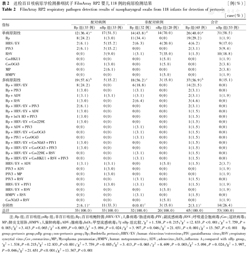 送检百日咳病原学检测鼻咽拭子FilmArray RP2婴儿118例的病原检测结果 [例(%)]