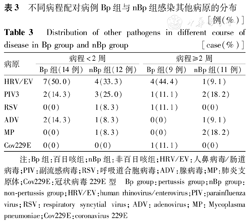 注:Bp组:百日咳组;nBp组:非百日咳组;HRV/EV:人鼻病毒/肠道病毒;PIV:副流感病毒;RSV:呼吸道合胞病毒;ADV:腺病毒;MP:肺炎支原体;Cov229E:冠状病毒229E型 Bp group:pertussis group;nBp group:non-pertussis group;HRV/EV:human rhinovirus/enterovirus;PIV:parainfluenza virus;RSV:respiratory syncytial virus;ADV:adenovirus;MP:Mycoplasma pneumoniae;Cov229E:coronavirus 229E