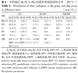 本研究Bp组65例的地区分布为北京42例、浙江嘉兴14例、安徽芜湖9例,3个地区多病原阳性检出率分别为59.5%(25/42)、57.1%(8/14)、44.4%(4/9),其中北京前3位混合感染病原为HRV/EV、PIV3、RSV,浙江嘉兴前3位混合感染病原为HRV/EV、ADV、PIV3,安徽芜湖前3位混合感染病原为HRV/EV、PIV3、RSV。nBp组北京、浙江、安徽前3位感染病原分别为RSV>HRV/EV>Cov、PIV3>HRV/EV>ADV、HRV/EV>PIV3>RSV,各地常见混合感染病原与nBp组常见检出病原不完全一致(表4)。