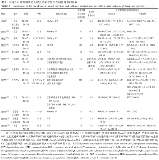 本研究显示婴儿百日咳混合其他病原感染率为56.9%,混合感染病原以HRV/EV检出为主,PIV、RSV、Cov次之,其他混合感染病原为ADV、InfA、HMPV。近十余年来国内外有关百日咳混合感染状况报道较多,百日咳患儿常混合其他病原,包括病毒、细菌、不典型病原体和真菌感染,但基于不同研究对象、方法、年份的混合感染率差异较大(31.6%~94.3%)[5,6,7,8,9,10,11,12,13,14,15,16](表5),不同报道中常见混合感染病原因而有所不同,HRV常是第1位的混合感染病毒[6,7,8,14,15],也有显示最常见混合感染病毒为RSV[12,13]。