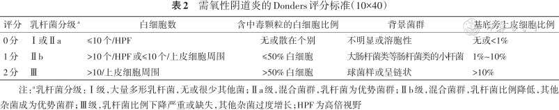 (3)Donders评分标准[25]:Donders评分是基于生理盐水湿片法,利用相差显微镜对乳杆菌、白细胞数量、含中毒颗粒的白细胞比例、背景菌群和基底旁上皮细胞(parabasal epitheliocytes,PBC)比例进行评价分级的评分标准,目前在国内外被推荐用于需氧性阴道炎(aerobic vaginitis,AV)的辅助诊断,其具体评分标准见表2。但该法使用相差显微镜直接湿片镜检,未进行染色,部分有形成分识别难度大,限制了使用范围。近年来,有国内专家提出了基于革兰染色涂片联合临床特征的改良AV诊断标准[26, 27, 28]。