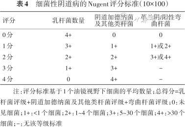 注:评分标准基于1个油镜视野下细菌的平均数量;总得分=乳杆菌评级+阴道加德纳菌及其他类杆菌评级+弯曲杆菌评级;0:未见细菌;1+:<1个细菌;2+:1~4个细菌;3+:5~30个细菌;4+:>30个细菌;-:无该等级标准