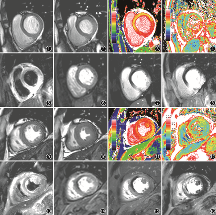 除直接表现外,AMI患者可能出现一系列并发症,这些并发症将在很大程度上决定患者的预后,且一些并发症需要特定手段进行治疗,因此对并发症进行诊断与评估同样是心脏MR检查的重要任务。需要注意的是,同一患者中可能同时出现多种不同类型的并发症(图9~16)。
