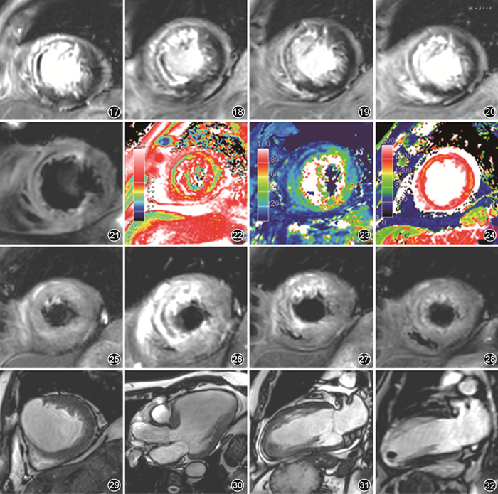 心肌内出血范围随时间变化规律同样较复杂。通过T2 mapping及T2* mapping进行评估时,早期范围逐渐增大,并在梗死后3 d左右达到峰值,后逐渐吸收[17]。至慢性期部分患者的心肌内出血吸收后可能不明显,部分患者由于含铁血黄素沉积而长期阳性(图25~28)。