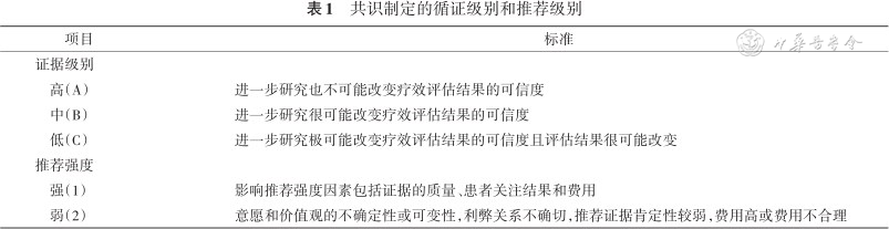 4.循证级别:共识采用循证医学等级见表1,证据级别和推荐强度相结合,证据级别可信度从高到低分为A、B、C,推荐强度从强到弱分为1和2。推荐强度主要考虑证据质量、治疗效果、治疗方法简易程度和资源获取等。
