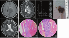 患者 女,45岁,因"右侧肢体麻木、无力半个月余,头晕2 d"入院。入院体格检查:神志清楚,对答切题,遵嘱动作,格拉斯哥昏迷评分(GCS)为15分。双侧瞳孔等圆、等大,直径约为2.5 mm,对光反射灵敏。颈强直(-),四肢肌力、肌张力检查未见明显异常。生理反射存在,病理反射未引出。半个月前于外院门诊行头颅CT检查显示左侧侧脑室内一占位性病变,最大直径约为3.5 cm。入院后第5天,患者的头晕症状明显加重,并出现嗜睡,予20%甘露醇静脉滴注后症状缓解。急诊行头颅MRI、弥散加权成像(DWI)和磁共振波谱(MRS)检查,MRI结果提示:左侧侧脑室体部可见一类圆形异常信号影,边界尚清,大小约为60 mm×43 mm×40 mm,病灶T1加权成像(T1WI)呈稍低信号,前缘可见斑片状高信号灶,T2加权成像(T2WI)呈混杂信号,以稍高信号为主,其内可见多发小囊变区(图1A,B)。DWI可见明显弥散受限,病灶周围可见大片水肿带,中线结向右侧偏移约12 mm。MRS结果显示,病灶区域乙酰天冬氨酸(NAA)峰明显降低,胆碱(Cho)峰明显升高,NAA/(Cho+肌酐)比值倒置(图1C)。考虑到肿瘤生长迅速,于入院后第2天行肿瘤切除术。在气管插管全身麻醉下,取右侧顶部"马蹄"形切口,经顶下小叶皮质造瘘进入4 cm后,可见血运丰富的鱼肉样肿瘤组织,质地不硬,伴有瘤内出血(图1D)。予快速瘤内减压,以吸引器和取瘤镊沿肿瘤边缘探查,发现肿瘤供血血管后予以电凝,打开侧脑室壁,彻底清除脑室内残留的血肿。术后第2天复查MRI显示肿瘤完整切除(图1E)。术后HE染色结果显示,病变由异型细胞构成,可见多核瘤巨细胞和核分裂象,以及大片坏死及横纹肌样细胞,间质可见黏液样变性(图1F,G)。术后免疫组织化学结果提示:INI-1(未缺失)、CD99(-)、Syn(-)、CD34(-)、STAT6(-)、BRAFV6OOE(-)、SSTR2(少灶+)、MyoDl(-)、Myogenin(-),病变符合(颅内)高级别肿瘤。鉴于根据免疫组织化学结果未能明确其病理学分型,行高通量基因检测(NGS二代测序)明确有无特殊的分子遗传学特征,分子检测结果提示:体细胞变异CIC-NUTM1融合(+),病变符合(颅内)CIC重排肉瘤。术后患者未诉特殊不适,无抽搐发作,左侧肢体肌力为Ⅳ+级,余无明显神经系统功能障碍。术后于外院继续行放射治疗。