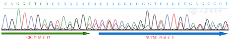 CIC重排肉瘤是最近新定义的脑肿瘤类型,属于发生于脑膜的非脑膜上皮源性间叶肿瘤,目前尚属未确定分化方向的恶性肿瘤[8]。目前对于CIC-NUTM1肉瘤的精确分类尚有争议,Mangray等[6]认为,将CIC-NUTM1肉瘤归类为NUT癌或许比归类为CIC重排肉瘤更为准确。目前的常规免疫组织化学检测结果仅能确定其是否为高级别肿瘤,不能明确病理学分型,需行高通量基因检测(MGS二代测序)明确有无特殊的分子遗传学特征,再根据这些特征进行分类。本研究中,通过对肿瘤标本进行相关检测,更倾向于将其归类为CIC重排肉瘤。