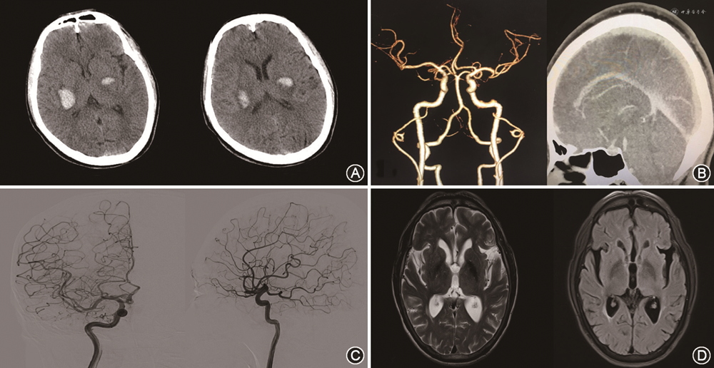 临床资料 患者男性,51岁,因“突发四肢乏力2 h”于2022年3月5日急诊入院。发病当时在进午餐,表现为突发双上肢持物不稳,伴行走醉酒样状态。既往有“高血压病”史10年,平素未规律服药控制;无其他脑血管疾病及口服药物抗凝史。入院时血压158/98 mmHg(1 mmHg=0.133 kPa)。嗜睡,双侧瞳孔直径2.5 mm,对光反射灵敏,双侧眼球活动正常,无视力障碍、视野缺损,双侧鼻唇沟对称,伸舌剧中,左上肢指鼻试验浅稳,右下肢跟-膝-胫实验弱阳性,左上肢肌力Ⅳ+级,右上肢及双下肢肌力Ⅳ级,双侧额面部及肢体浅、深感觉对称,双侧Babinski征阳性,颈抵抗阴性。急诊行头颅CT示:双侧基底节区高密度影,粗测左侧血肿体积约5 ml,右侧血肿体积约15 ml;CT动脉造影及CT静脉造影未见明显颅内动脉瘤、血管畸形以及静脉窦狭窄、闭塞等。凝血功能检查示:凝血酶原时间13.7 s、部分凝血活酶时间41.1 s、国际标准化比值1.03、D-二聚体1.26 μg/ml,均在正常范围内。入院后予止血、脱水、降压等保守治疗措施,次日意识状况好转为清醒,动态复查头颅CT示血肿稳定并逐渐吸收。入院1周患者病情稳定后行数字减影血管造影检查,未见明显颅内血管性病灶。左下肢肌力好转为Ⅳ+级,其余肌力好转至Ⅴ级。出院后行高压氧舱治疗2个疗程,随访1年时行头颅磁共振平扫、增强及血管成像检查示双侧基底节区软化灶,未见明显动静脉畸形、动脉瘤、海绵状血管瘤、动静脉瘘、烟雾病及脑肿瘤等征象,病情无复发,四肢肌力Ⅴ级(图1)。