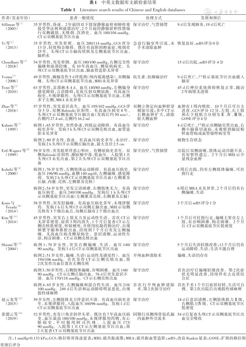| Choudhary等[3](2018) | 54岁男性,突发晕倒。血压180/100 mmHg,右侧完全性偏瘫和面部轻瘫。有10年高血压、糖尿病病史。头颅CT示双侧基底节区出血,脑血管造影无异常 | 保守治疗 | 15 d后出院,mRS评分 4分 |