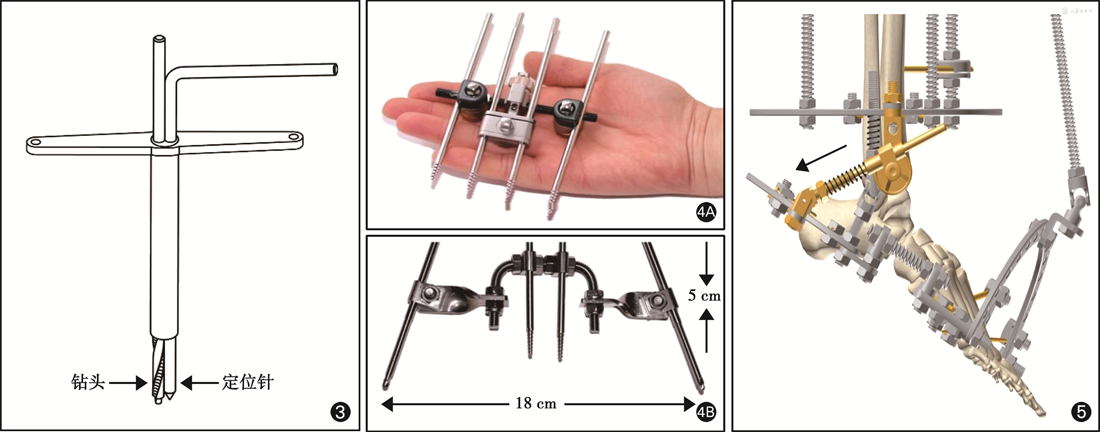 2.1.7 足踝中国构型:与俄罗斯、西方国家的构型不同,郑学建、秦泗河、彭爱民等根据亚洲人肢体残缺畸形的特点,预先组装好个体化的可调组合式外固定矫形器,同时结合弹性牵伸装置和螺纹半针技术,形成一个操作简单、调整方便且结构合理的新型构型,减少手术时间并增加患者舒适度,可满足多数足踝畸形矫正、残缺修复与功能重建的需要[25]。该构型首次提出在踝关节两侧增加弹性斜拉装置(获得国家专利)(图5),既能撑开踝间隙、保持微动,又能随旋转中心的变化而变化,使踝关节在相对固定的范围内运动,实现了足部矫形与踝关节保护同步进行[26]。