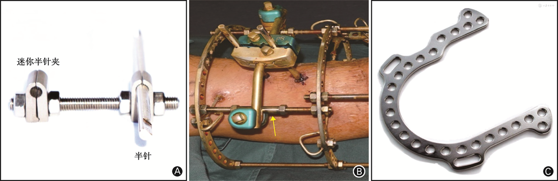 2.1.8 微创切开复位Ilizarov外固定(minimal open reduction and Ilizarov external fixation,MORIEF)概念的提出和系列器械的研发:Ilizarov器械最初为骨折而设计,后由于牵张成骨效果优越,该技术主要用于骨搬移和矫形领域[26, 27, 28],而在骨折领域的应用反而不足。中国有着大量的肢体复杂创伤患者。为进一步改进该器械的使用效能,朱跃良提出了MORIEF理念并设计了系列零部件,如应用迷你半针夹系统可在狭小空间内牢固灵活地固定住4~5 mm半针,M8空心套管可将现有的下肢组合外固定的零部件和Ilizarov外固定器械有效连接起来,避免了拆旧换新,节约了医疗成本,减少了患者的钉道损伤;设计的解剖型跟骨环比普通Ilizarov环的锁针和连杆效率更高[29](图6)。乔锋等[30]应用计算机辅助复位技术并与3D打印技术相结合,定制外固定架自动复位和治疗长骨骨折,术后根据骨折愈合的不同时期调整其断端应力大小,为MORIEF理念的进一步量化和细化。由此,Ilizarov外固定在创伤骨科领域保持了应用活力。