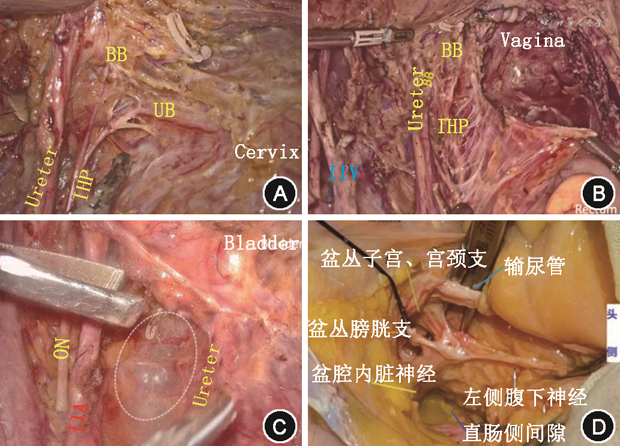注:Ureter为输尿管;Bladder为膀胱;Cervix为宫颈;Vagina为阴道;Rectum为直肠;IHP为下腹下丛;BB为膀胱支;UB为子宫支;ON为闭孔神经,椭圆来自第2~4对骶神经的盆腔内脏神经;IIA为髂内动脉;IIV为髂内静脉
