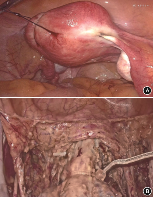 回顾腹腔镜广泛子宫切除术的过程,腹腔镜手术“无瘤”操作不当可能与预后不良相关,如术中举宫杯机械性压力相关性瘤细胞外溢。腔镜手术中长器械远距离操作特点对“无瘤”手术提出了新的要求。因此,我们在腹腔镜术式中采取一系列举措,以沿袭开腹手术中的“无瘤”原则。(1)手术之初电凝双侧输卵管根部,防止子宫腔内容物在术中流入腹腔;(2)术中子宫底悬吊替代举宫器,在提供一定张力的同时避免挤压宫颈病灶(图4A);(3)离断阴道前使用套扎环封闭子宫颈远端,避免宫颈病灶经阴道取出时的体内暴露(图4B);(4)术毕蒸馏水冲洗术野。