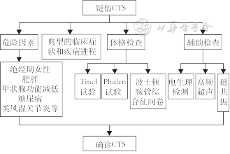 详细的病史、典型的临床症状和疾病进程是诊断CTS的重要依据,而一旦发现大鱼际肌的萎缩,则常意味着CTS已经进展到晚期[2]。EDX和HFUS可作为电生理学和形态学方面辅助诊断的方法,结合体格检查和调查问卷,综合考虑以上各种因素可以诊断CTS(图1)。