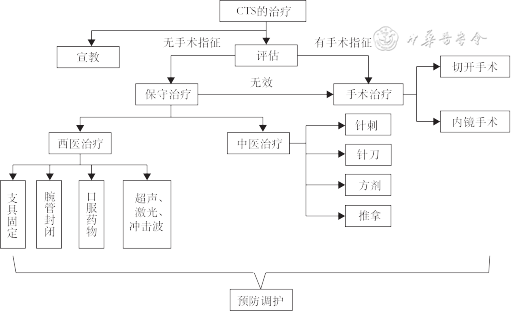 推荐意见3:对于CTS的治疗建议根据患者病情的轻重缓急采取中西医结合疗法(图2):(1)疾病初期患者仅有手部的麻木、刺痛和肿胀感。可选用支具固定,配合中药熏洗或口服,辅助以超声、激光或冲击波疗法。(2)病情进展者麻木和刺痛等症状的持续时间变长,并向前臂放射。可继续采用支具固定,中药熏洗和口服,加用腕管内注射,中医针刺或针刀治疗。(3)病情严重者会出现大鱼际肌的萎缩,对掌功能受限。此时建议采取手术治疗,术后辅助手法推拿和中医调护,促进神经功能恢复和防止复发。