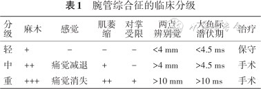 | 分级 | 麻木 | 感觉 | 肌萎缩 | 对掌受限 | 两点辨别觉 | 大鱼际潜伏期 | 治疗 |