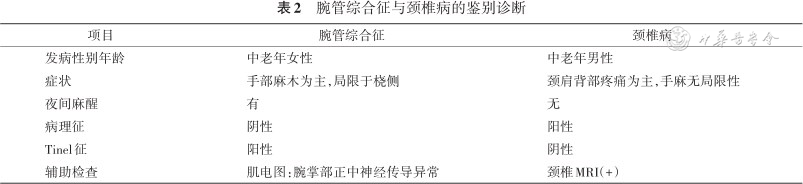 4.鉴别诊断:CTS的鉴别诊断主要有神经根型颈椎病(CSR)(表2)和其他外周神经卡压性疾病,如胸廓出口综合征、旋前圆肌综合征等。其中CSR是最容易与CTS相混淆的疾病[44],甚至可能存在CTS合并CSR的神经双卡压综合征(DCS)[45]。可通过详细了解病史、仔细的体格检查以及颈椎MRI等辅助检查加以鉴别(表2)。