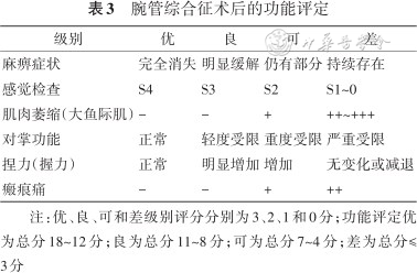 术后功能评定可参照表3,主要分为6个方面:麻痹症状、感觉检查、肌肉萎缩、对掌功能、握力和瘢痕痛[76]。除了对感觉和运动的评估之外,特别注重了术后的瘢痕痛,因为手掌在生活中使用非常频繁,而手心部位又特别敏感,瘢痕痛会造成持物困难,给生活带来极大不便。而应用可吸收或不可吸收缝线缝合伤口对于术后瘢痕痛的影响并无明显差别[77]。