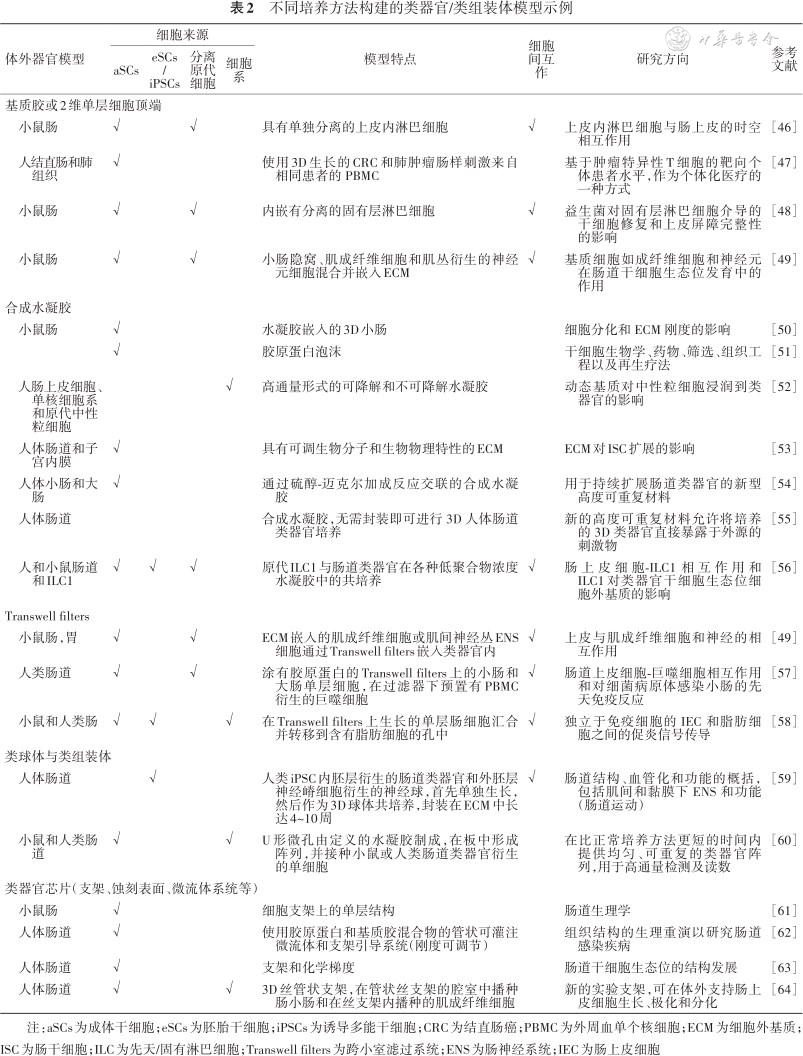 注:aSCs为成体干细胞;eSCs为胚胎干细胞;iPSCs为诱导多能干细胞;CRC为结直肠癌;PBMC为外周血单个核细胞;ECM为细胞外基质;ISC为肠干细胞;ILC为先天/固有淋巴细胞;Transwell filters为跨小室滤过系统;ENS为肠神经系统;IEC为肠上皮细胞