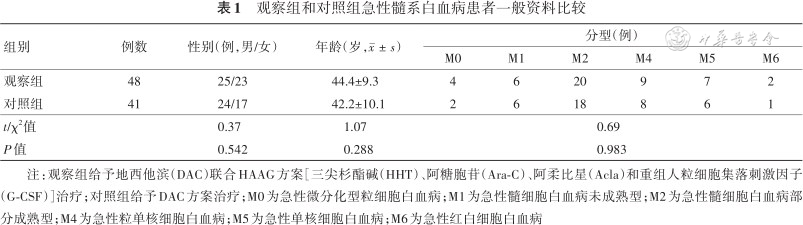 注:观察组给予地西他滨(DAC)联合HAAG方案[三尖杉酯碱(HHT)、阿糖胞苷(Ara-C)、阿柔比星(Acla)和重组人粒细胞集落刺激因子(G-CSF)]治疗;对照组给予DAC方案治疗;M0为急性微分化型粒细胞白血病;M1为急性髓细胞白血病未成熟型;M2为急性髓细胞白血病部分成熟型;M4为急性粒单核细胞白血病;M5为急性单核细胞白血病;M6为急性红白细胞白血病