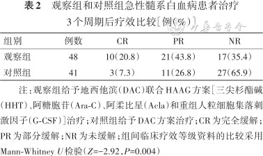 观察组和对照组急性髓系白血病患者治疗3个周期后疗效比较[例(%)]