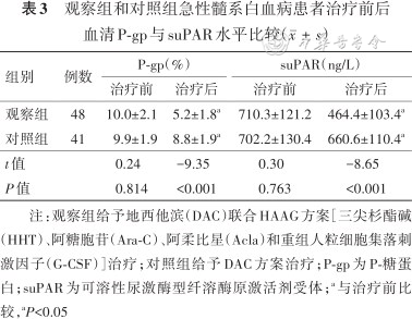 注:观察组给予地西他滨(DAC)联合HAAG方案[三尖杉酯碱(HHT)、阿糖胞苷(Ara-C)、阿柔比星(Acla)和重组人粒细胞集落刺激因子(G-CSF)]治疗;对照组给予DAC方案治疗;P-gp为P-糖蛋白;suPAR为可溶性尿激酶型纤溶酶原激活剂受体;a与治疗前比较,aP<0.05
