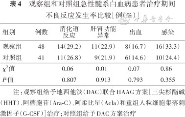 DAC作为一种脱甲基药物,治疗骨髓增生异常的疗效较好,现已应用于AML的治疗[11, 12]。本研究中,观察组治疗效果优于对照组,提示DAC联合HAAG方案治疗复发AML的疗效较好。