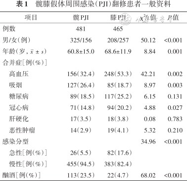 本研究发现,相比膝PJI组,髋PJI组患者年龄更小,男性、酗酒比例更高,糖尿病、冠心病比例更低,慢性感染更多,这与手术类型及不同的发病部位相关。Bozic等[31]报道髋PJI翻修和膝PJI翻修患者的平均年龄相似(65.4岁比65.7岁)。性别分布也几乎相等。