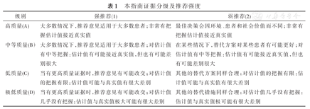 | 高质量(A) | 大多数情况下,推荐意见适用于大多数患者;非常有把握估计值接近真实值 | 最佳决策会因环境、患者和社会价值而不同;非常有把握估计值接近真实值 |