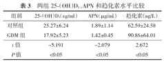 与对照组比较,GDM组25-(OH)D3、APN水平均明显降低(均P<0.05),趋化素水平明显升高(P<0.05),见表3。