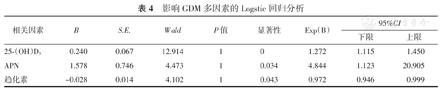 如表4所示,血清25-(OH)D3、APN和趋化素均为GDM的相关影响因素(均P<0.05)。