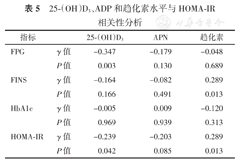 Spearman相关性分析结果显示血清25-(OH)D3与FPG和HOMA-IR存在负相关(均P<0.05);趋化素与FINS、HOMA-IR存在正相关(均P<0.05),见表5。
