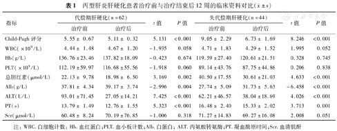 丙型肝炎肝硬化患者治疗前与治疗结束后12周的临床资料对比(