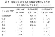 在治疗过程中未出现严重药物不良事件。106例患者中主要出现不良反应为贫血11例(10.4%),乏力5例(4.7%),腹泻2例(1.9%)等。代偿期肝硬化患者出现贫血6例(9.7%),乏力3例(4.8%),粒细胞减少1例(1.6%),头痛1例(1.6%)。失代偿期肝硬化患者主要出现不良反应为贫血5例(11.4%),乏力2例(4.5%),腹泻2例(4.5%)等(表2)。无因上述不良事件调整治疗方案或停药患者。