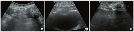 病例3,男,11岁5个月,因偶然发现腹部包块1个月余,在当地医院活检术后病理考虑促结缔组织增生性小圆细胞来院就诊。超声检查发现腹腔及盆腔肠系膜、大网膜、腹膜、膈肌、肝脏,肠壁、膀胱壁浆膜侧等处可见多发大小不等低回声包块,形态不规则、呈分叶状,较大病灶内多发砂砾样钙化灶,部分可见声影(图3),肠间隙有少量清亮腹腔积液。规律化疗后行手术切除,切除肉眼可见所有病灶,术后病理诊断促结缔组织增生性小圆细胞肿瘤,基因检测显示EWSR1基因断裂阴性。术后继续化疗并每隔1个月左右定期超声随访,术后2个月后超声显示膀胱壁复发病灶,目前仍在化疗中,肿瘤有所缩小。该病例发病至今随访时长共7个月。