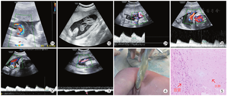 孕妇,27岁,孕5产1。孕27+1周自觉腹部胀痛来承德市中心医院就诊。行胎儿超声检查:单胎头位,脊柱连续,双顶径70 mm,头围243 mm,腹围235 mm,股骨长47 mm,胎儿心率140次/min,规律,羊水指数7.37 cm,内透声好,胎盘位于子宫前壁,厚度29 mm,Ⅰ级,胎儿胸腔及腹腔各脏器及肢体均未见明确异常,羊水中见脐带漂浮,横断面呈"品"字形结构,发现脐带局部增宽,最宽处约32.5 mm(图1),脐血管周围有宽约16 mm的液性无回声区,脐动脉阻力指数(resistance index,RI)0.41,收缩期峰值血流速度/舒张末期血流速度(systolic/diastolic,S/D)1.70,加速时间(acceleration time,AT)84 ms(图2A),胎儿皮肤未见明显水肿征象。考虑胎儿脐带回声异常,脐带水肿可能。孕27+5周出现劳累后阵发下腹痛,超声检查提示:脐动脉RI 0.51,S/D 2.02,AT 66 ms(图2B),余与第一次检查变化不大,考虑脐带水肿。孕28+1周复查超声提示:胎儿颈部可见脐带压迹,呈"U"形,脐带迂曲反折,脐血管周围可见液性无回声区,最宽处约35 mm,脐动脉RI 0.57,S/D 2.31,AT 86 ms(图2C),另外在脐带水肿明显处测及AT延长的小慢波,表现为RI降低、AT延长、收缩期波峰消失,呈低速低搏动性频谱(图3)。超声诊断:①晚期妊娠,单胎,头位,左枕前位;②胎儿脐带绕颈1周;③胎儿脐带回声异常,脐动脉血流频谱异常,考虑脐带水肿伴脐血流受阻可能。孕28+2周患者出现腹部紧缩感,伴轻微下腹痛及腰痛,腹痛逐渐加重,随后顺产一男婴,体重1 150 g,Apgar评分1 min 1分,5 min 2分,10 min 9分,入新生儿监护室。胎儿脐带娩出后见脐带局部增粗,明显肿胀,颜色稍苍白,呈半透明状。经测量:脐带总长度62 cm,无水肿处平均直径1.5 cm,局部水肿处长度14 cm,平均直径3.5 cm(图4)。产后脐带病理报告示:脐血管3根,水肿液积聚于脐带间质纤维结缔组织内,颜色淡染,局部伴黏液变性(图5)。
