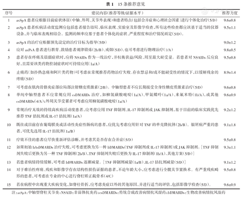 | 1 | axSpA患者应根据目前症状体征(中轴、外周、关节外表现)和患者特点(包括合并症和心理社会因素)进行个体化治疗(5/D) | 9.6±0.8 |