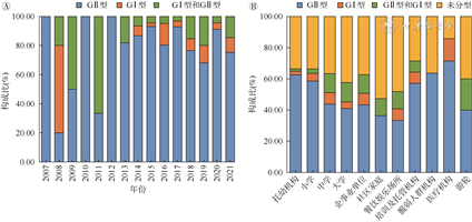(5)病原学分析:1 102起(63.88%)疫情具有病原分型结果,623起(36.12%)疫情病原结果未进行分型。明确病原分型的疫情中,诺如病毒GⅡ基因型为引起暴发的主要型别,共报告899起(81.58%);其次为GⅠ和GⅡ混合型(117起,10.62%)和GⅠ型(86起,7.80%);不同年份病原构成分析结果显示,GⅡ型占比逐年增加,2014年起,GⅠ型开始占一定比例,2014-2021年GⅠ型占比为1.09%~8.91%。见图4A。